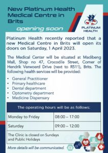 Newsflash New Platinum Health Medical Centre in Brits opening soon 3rd March 2023 Comments are off for this post PlatHea_AdMiN Share: 322