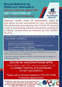 Platinum Health Newsflash RBPlat Dependants aged 18 and above can get vaccinated at La Femme in Rustenburg 24th August 2021 Comments are off for this post PlatHea_AdMiN Share: 85